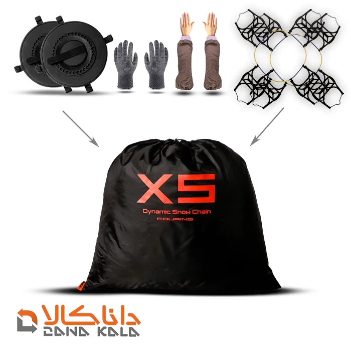 متعلقات شامل کیف برای حمل و نگهداری و دستکش و آستینچه ( برای جلوگیری از کثیف شدن لباس در زمان نصب زنجیر چرخ) که باعث نصب سریع و راحتر زنجیر چرخ چری a 15 میشود.